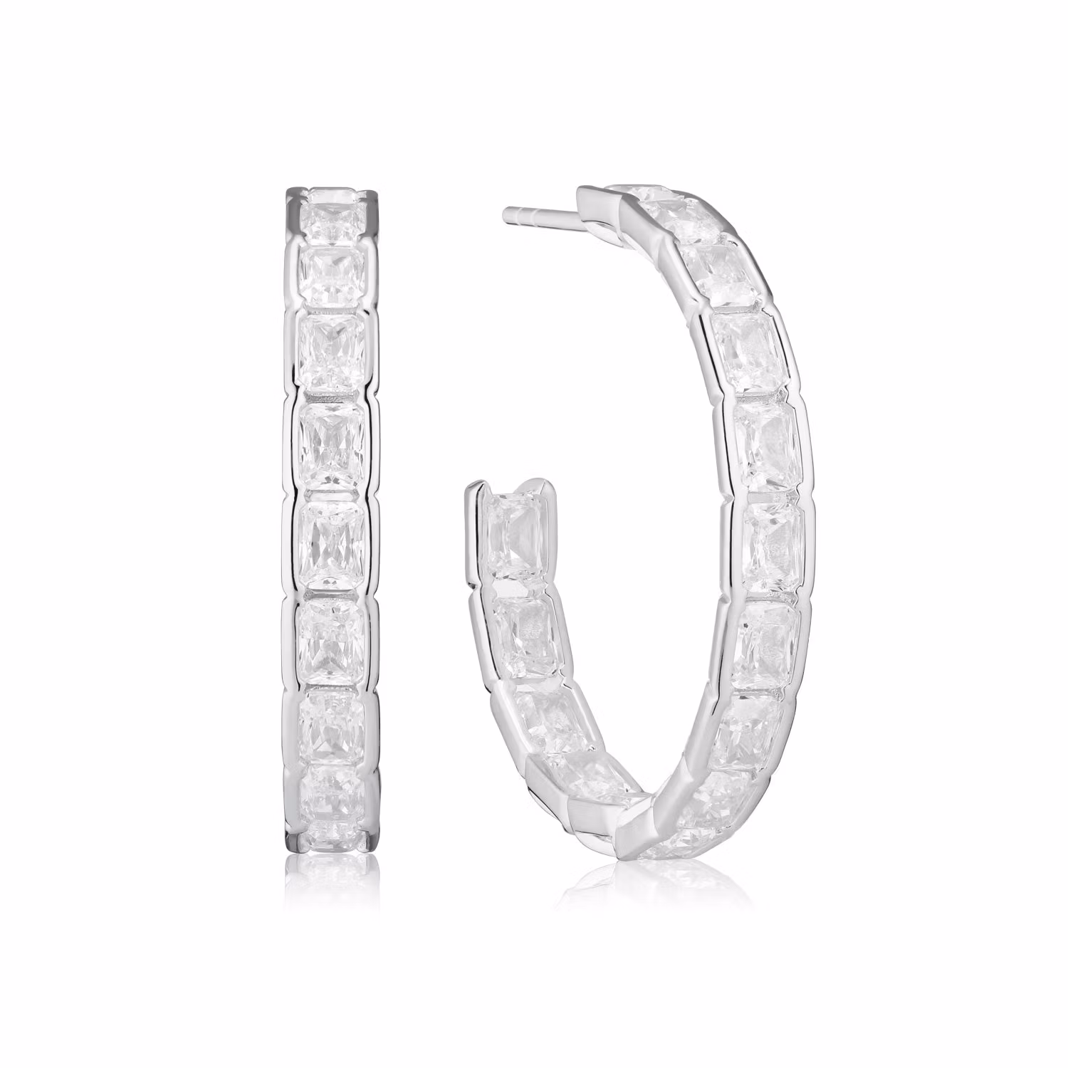 Örhängen i rhodinerat 925 Sterling silver med polerad yta och handplacerade smaragdslipade vita zirkoner.Örhängets mått: Diameter 30 mm, bredd 4.3 mm, tjocklek